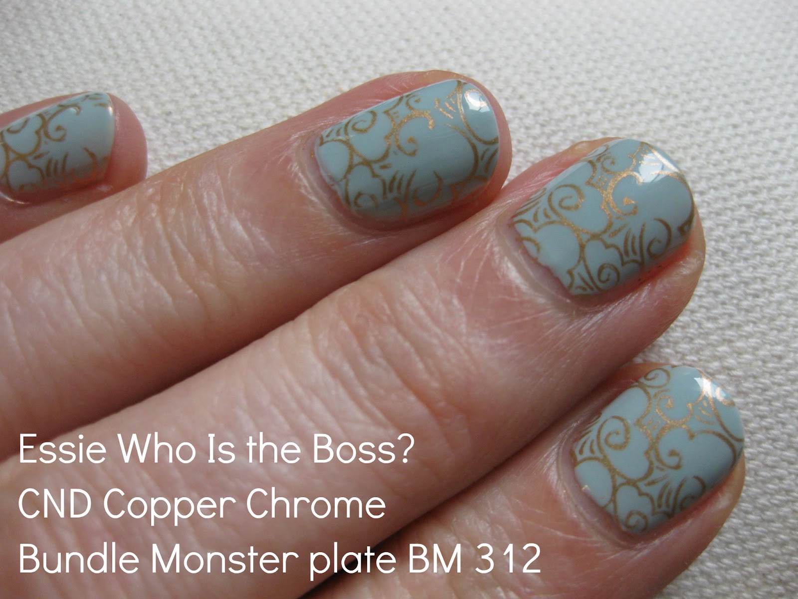 A few days ago, I rediscovered CND Copper Chrome in my polish stash, and decided I wanted to use it for a stamping.  I looked around to see what color and image would go well with it, and settled on Essie Who Is the Boss and this stylized cloud pattern: